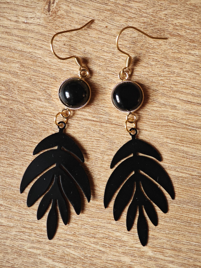 Serties en laiton doré à l'or fin, elles offrent un éclat délicat. Les pendentifs en forme de feuilles noires évoquent la légèreté de la nature. L'attache en acier inoxydable doré garantit solidité et confort, pour une qualité durable.