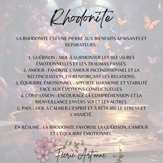La Rhodonite est une pierre qui favorise la guérison émotionnelle, apaise les blessures du cœur et aide à surmonter les traumatismes. Elle renforce l'empathie, la compassion et soutient les relations, en encourageant le pardon et la réconciliation. Sur le plan physique, elle est utilisée pour stimuler le système circulatoire et soutenir la récupération après des blessures. La Rhodonite aide à équilibrer les émotions et à apporter la paix intérieure, tout en favorisant l'auto-estime.