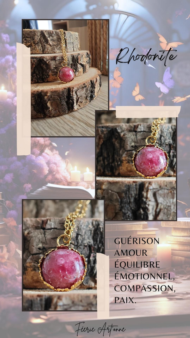 Sublimez vos émotions avec ce collier en Rhodonite, pierre de l’amour et de la guérison émotionnelle. Elle apaise les blessures du passé et nourrit la compassion.