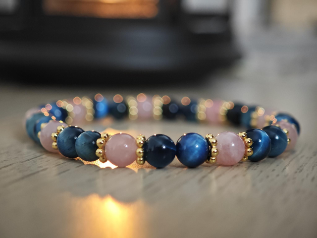 Ce bracelet délicat en quartz rose de Madagascar et œil de tigre teinté bleu de 6 mm est une création unique, conçu pour sublimer les petits poignets féminins. Élégant et apaisant, il dégage une énergie douce et protectrice, inspirant paix et équilibre.