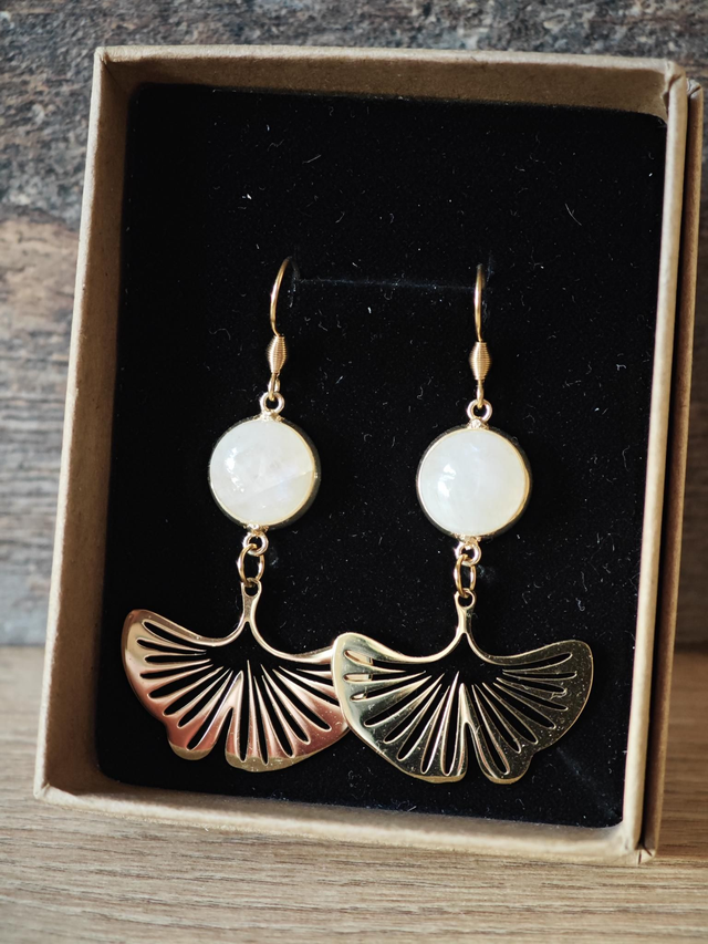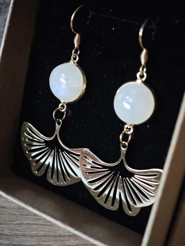 Ces boucles d'oreilles allient la pureté de la pierre de lune à l'éclat doré de l'acier inoxydable.