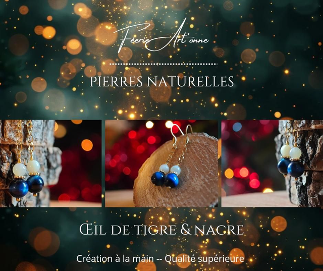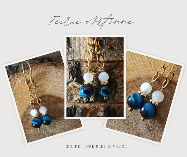 De l’alliance de l’Œil de tigre bleu et de la nacre est née cette paire de boucles d’oreilles unique, façonnée avec tout mon amour pour révéler toute la beauté et la magie des pierres.