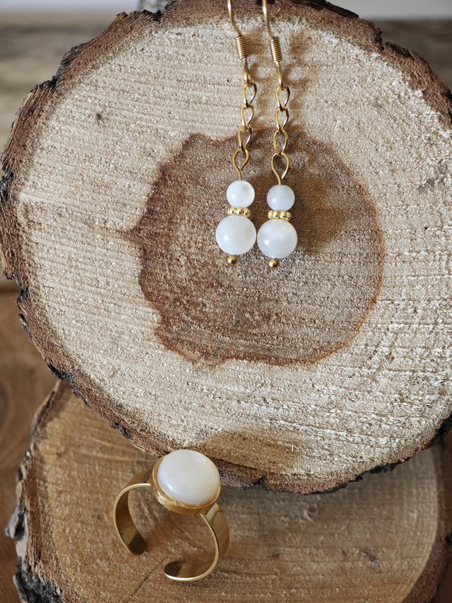 Découvrez cet ensemble composé d’une délicate paire de boucles d’oreilles ornée de nacre AAA, aux dimensions 6 mm et 4 mm, accompagnée d’une superbe bague réglable ornée d’une pierre en nacre de 10 mm.