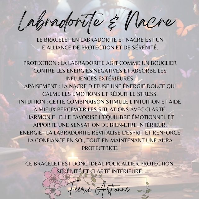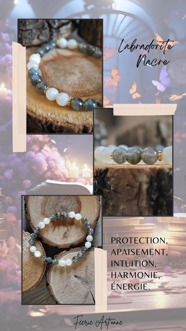 La labradorite apporte protection et équilibre émotionnel, tandis que la nacre favorise la sérénité et l’harmonie intérieure. Ensemble, elles créent une énergie apaisante et confiante.