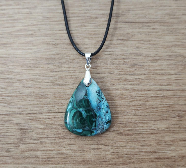 Trouvez l'harmonie avec notre sublime pendentif en chrysocolle et malachite, une fusion de deux pierres naturelles en forme de goutte, mesurant environ 3 cm de longueur. Ornée d'une bélière en argent 925 et suspendue à un cordon, cette pièce unique incarne la paix intérieure et la connexion avec la nature.
