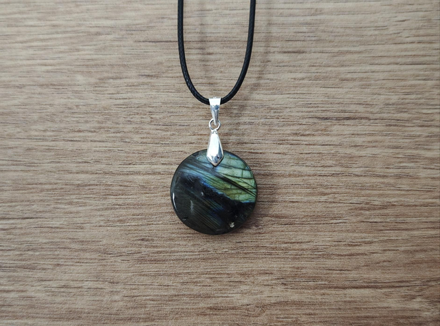Superbe pendentif en labradorite aux reflets verts, une pierre ronde d'environ 2 cm de diamètre, ornée d'une bélière en argent 925. Accompagné d'un cordon élégant, ce bijou vous offre une touche de mystère et d'élégance.