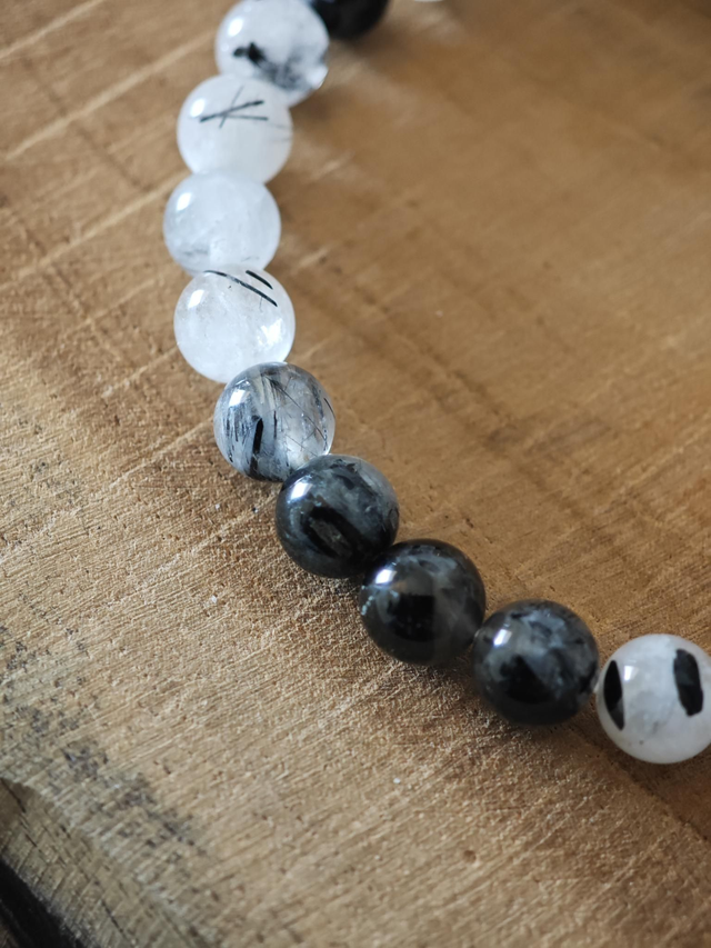 Bienfaits : Le quartz tourmaline combine les propriétés protectrices de la tourmaline noire avec la puissance amplificatrice du quartz. Il aide à éloigner les énergies négatives tout en élevant le taux vibratoire, favorisant équilibre, clarté mentale et enracinement.