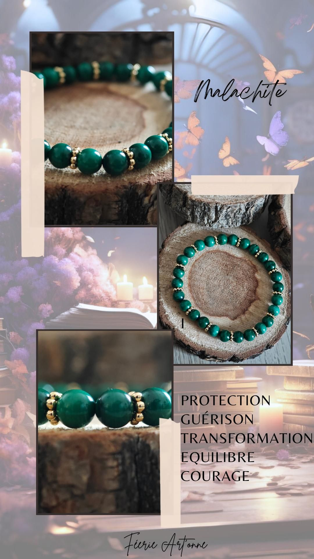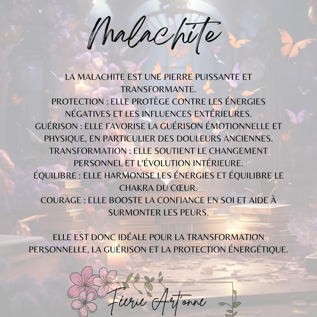 ✨ La malachite est réputée pour ses vertus apaisantes et régénératrices. Elle favorise l'équilibre émotionnel, calme le stress et stimule la créativité. Idéale pour ceux qui cherchent à se reconnecter à leur énergie intérieure et à la nature.✨